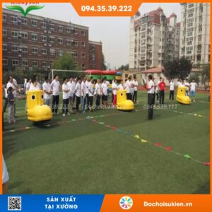 Người chơi phải nâng cao chiếc giày để di chuyển thật nhanh về đích. Chiếc giày bơm hơi được làm từ bạt PVC chống tia UV lành mạnh cho người chơi.