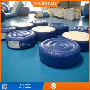 - Đệm tròn nổi được xếp so le với nhau trong tổ hợp trò chơi trên vịnh phao nổi